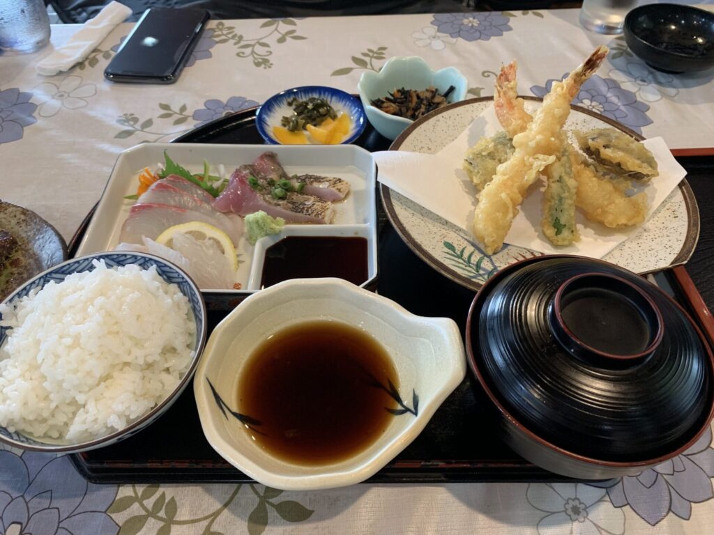 とにかくボリュームたっぷりで、刺身・天ぷら・壱岐牛ステーキと3種類を存分に楽しめるのでこれだけで大満足の一品です。なによりお米が美味しい・・!さすが壱岐で獲れたお米は違いますね。お米だけで食べれるくらいの美味しさです。出発ギリギリまで腹ごしらえできる場所があるのはありがたいです。