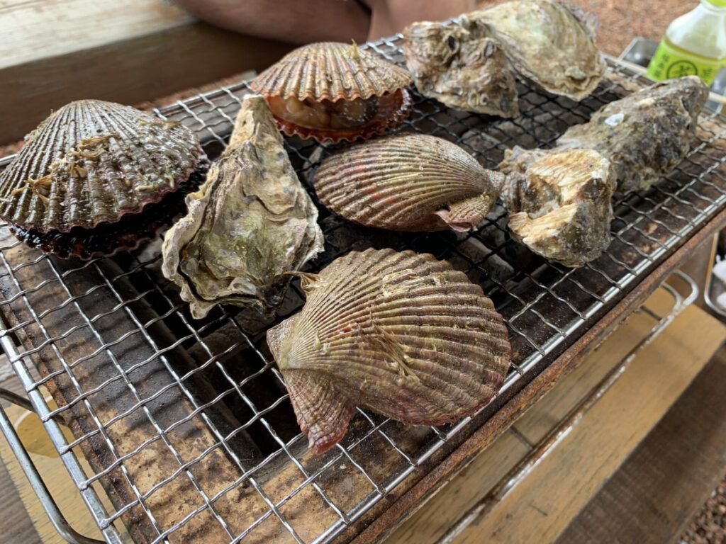 この写真のような感じで、自由に牡蠣やホタテなどを焼いて食べることができます。